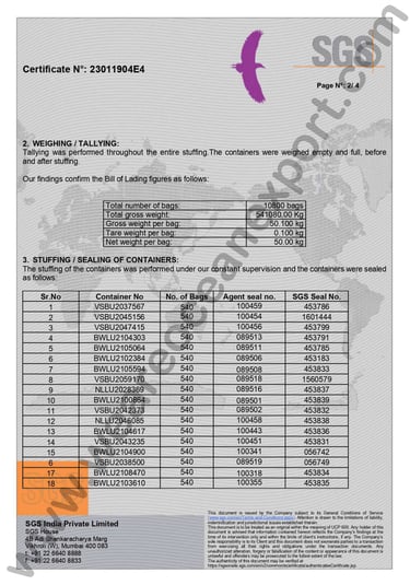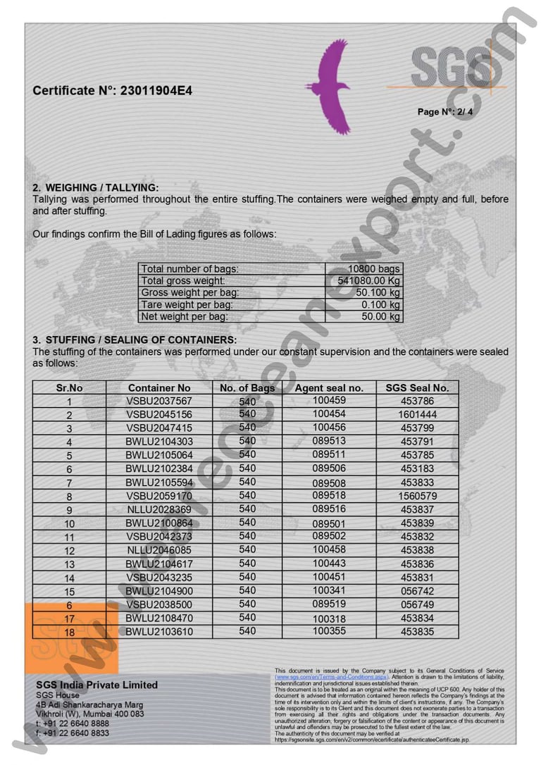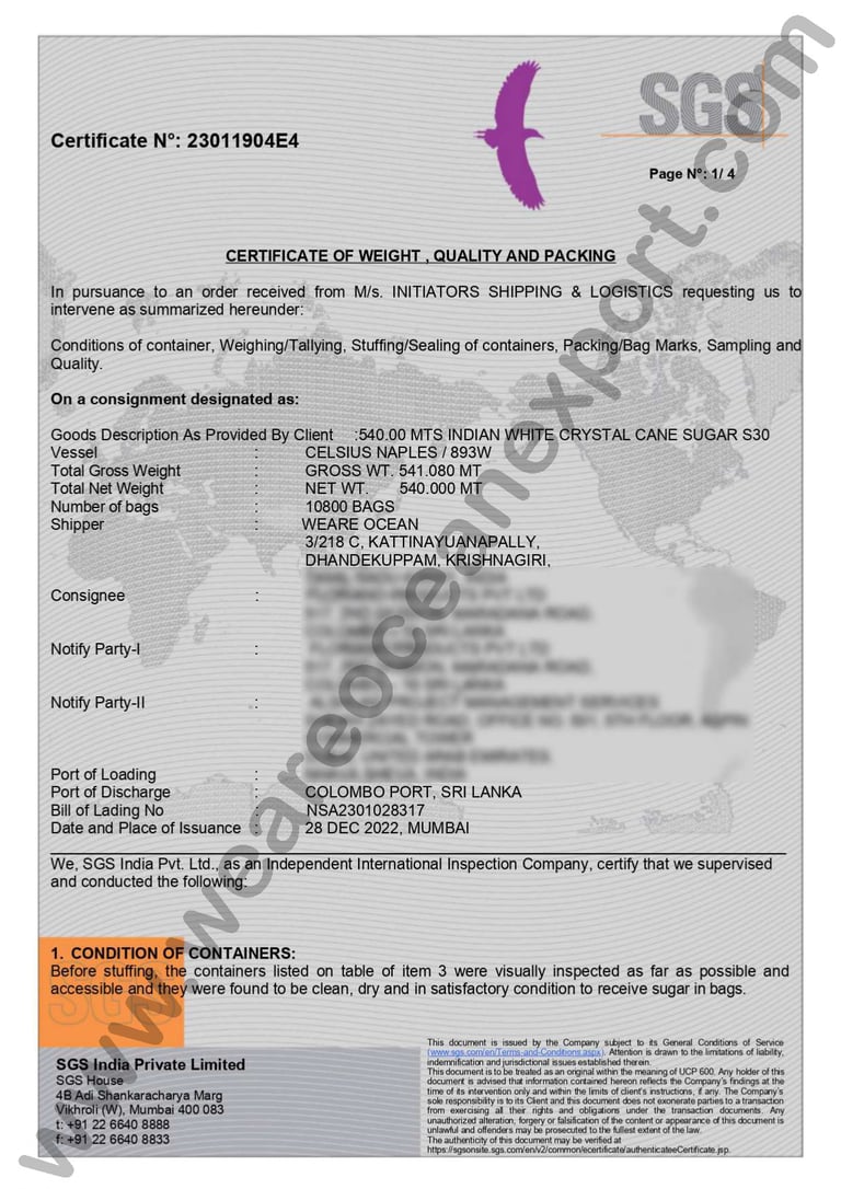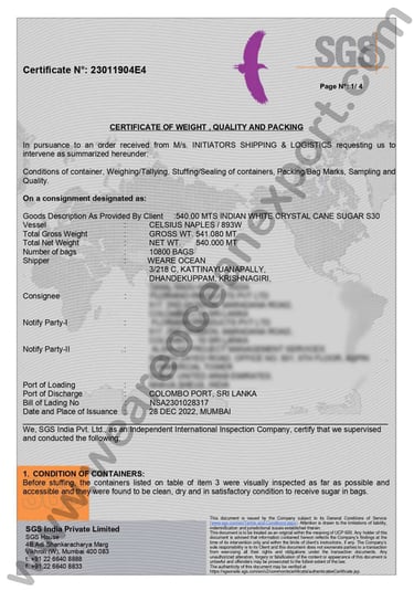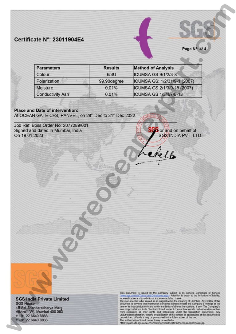 SGS-Certified White Crytal Sugar– Inspection Report, Mumbai Port, Maharashtra