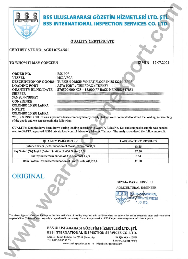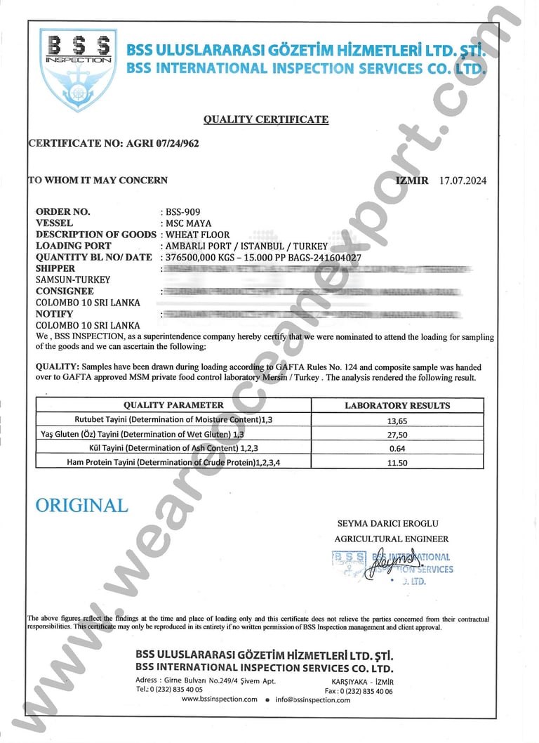 BSS - Certified Wheat Flour – Quality Inspected at Ambarli & Tekirdag Ports, Turkey for shipments to Colombo, Sri Lanka